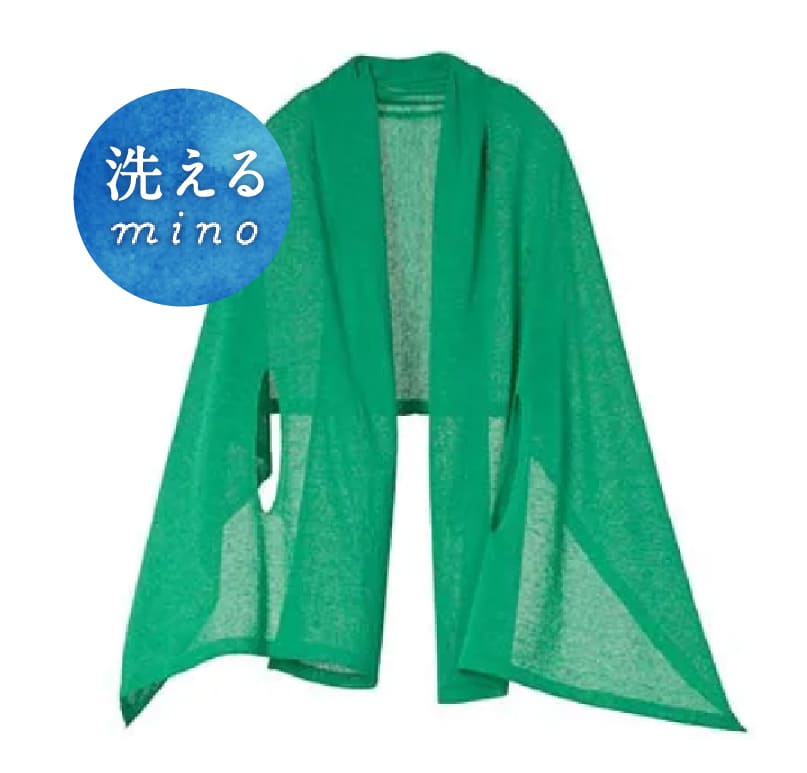 日本一のニット産地新潟県五泉市のポンチョブランド「mino」の、家でお洗濯できるお手入れしやすいシリーズ。軽くてサラリとしたドライタッチで、日差しよけや冷房対策に重宝する一着です。ひざ掛けやストールとしてもお使いいただけます。