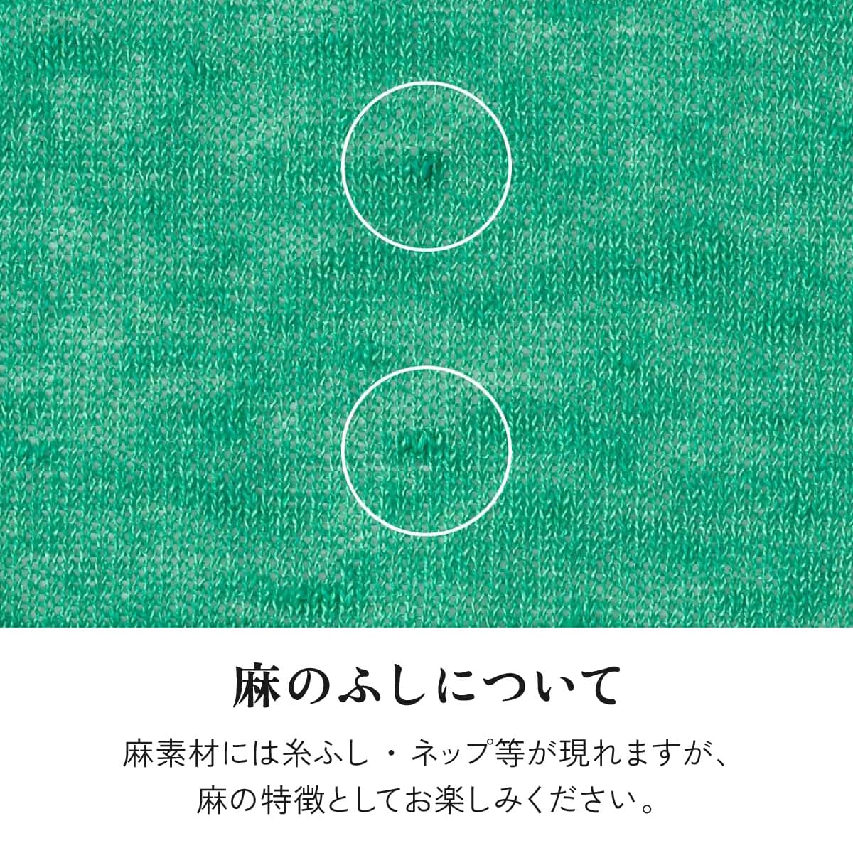 「麻70% ポリエステル30%」の糸を使用し、お洗濯しても傷みにくく、シワになりにくいので、洗った後に広げて干すだけの手軽さです。また、ポリエステルは吸水性が低いので、速乾性にも優れています。