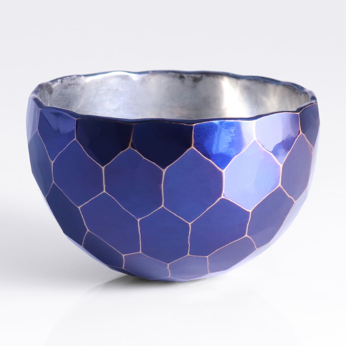 古くから金・銀・銅・錫などの耐蝕・加工性に優れた金属は、美術工芸品に用いられてきました。「鎚起」とは鎚(つち)で素材を打ち起こすという意味で、金属を叩いて加工する技法の事を指します。鎚起は一枚の金属素材を様々な鎚と当て金を使い、打ち延べ、打ち縮めて製品を作る伝統技術です。金属は叩き続けると硬化するため、その度に焼き鈍(なま)し、火炉で真っ赤になるまで熱したのち、再び軟らかくしてから目的のかたちになるまで叩き、この作業を交互に繰り返して成形していきます。この鎚起は鍛金の一種であり、さらに成形後の金属の表面に打出し・片切彫り・象嵌(ぞうがん)などの装飾を施す技術を彫金と呼びます。鎚目(つちめ)模様で表面を整えた後、緑青(ろくしょう)と硫酸銅を合わせた液で煮込み着色を施し、質感や色味を整えます。