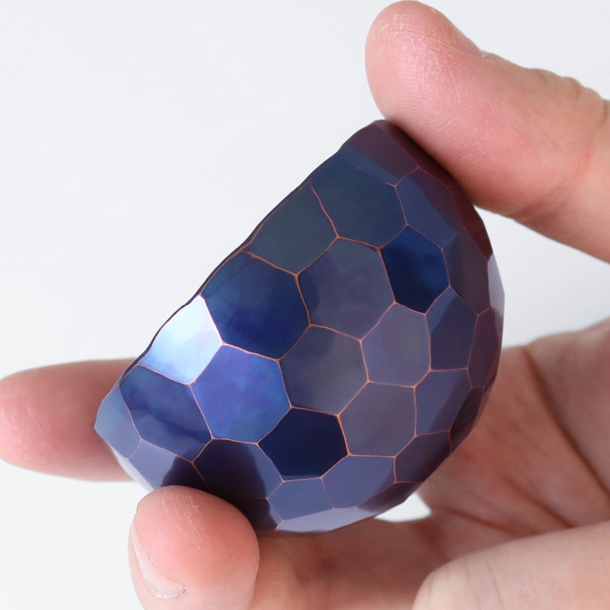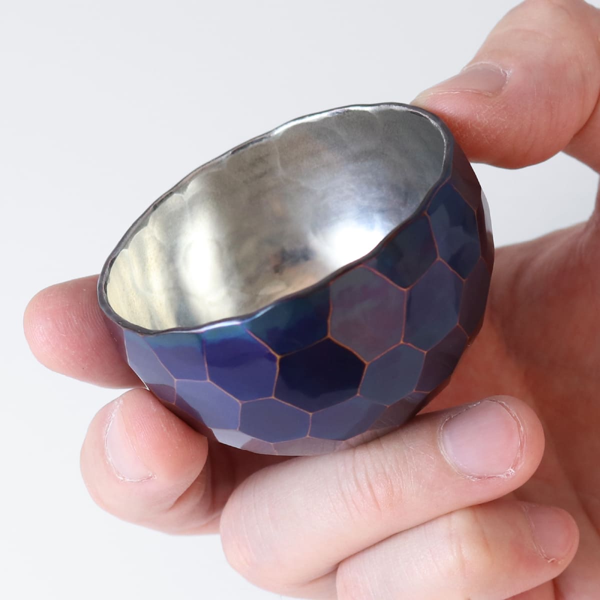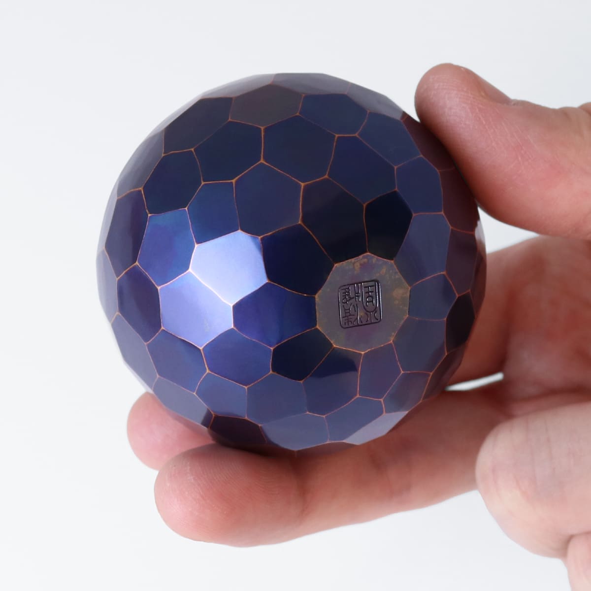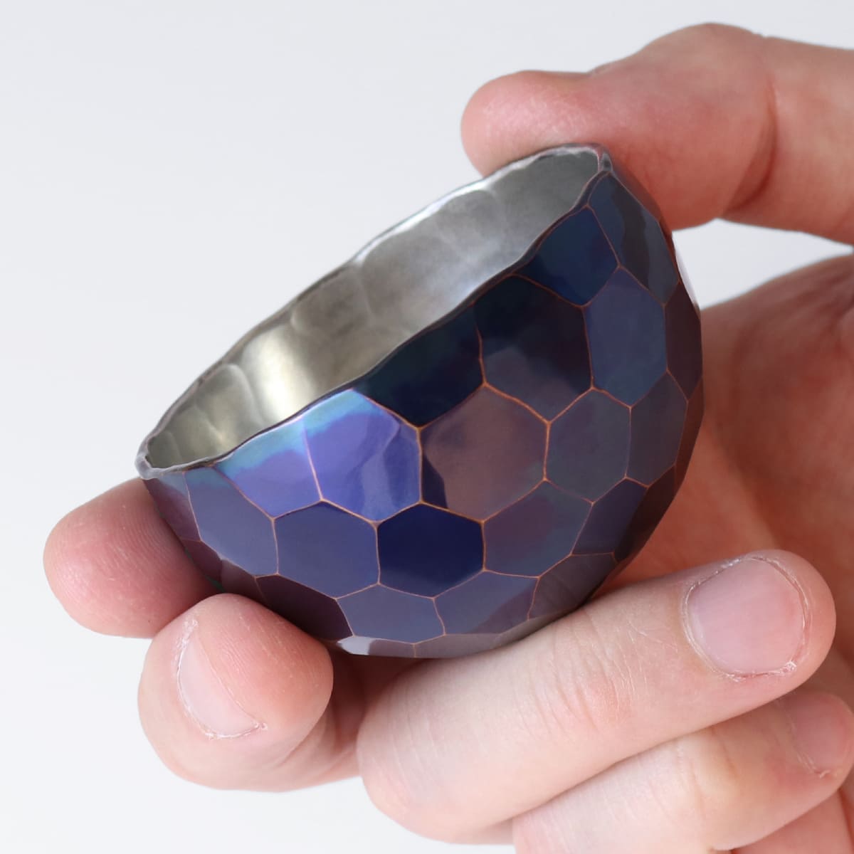 鎚起銅器の特徴のひとつに挙げられるのが、さまざまな色に発色した表面処理です。これらは塗料を塗ったものではなく、薬品によって酸化させた云わば錆の色です。銅を放っておくと次第に黒くなり、いずれは緑青がふきます。(自然にふいた緑青には毒性はありません)それと同じく鎚起銅器の製品の発色も長い年月で徐々に変色していくのは避けられません。