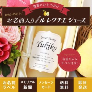 幻の洋梨ルレクチエジュースに名入れラベルが付いたオリジナルギフト。かわいいデザインのラベルにはお名前や感謝のメッセージを自由に入れられます。砂糖不使用、果汁100%のジュースは濃厚で果実そのままの味わ…