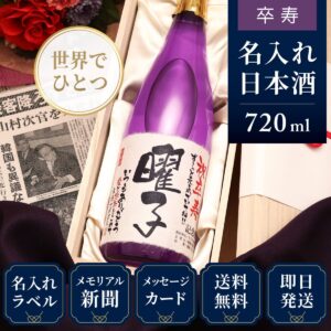 卒寿祝いに贈る世界に1つの名入れ日本酒。卒寿のお祝い色、紫色の瓶にお名前やメッセージ等お好きな内容を入れたのオリジナルラベルをお付けします。さらに90年前の生まれた日の新聞付きでサプライズ。日本酒最高…