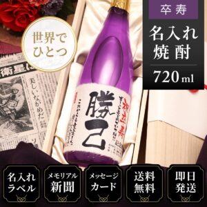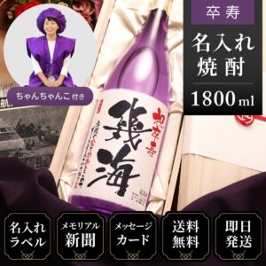 美しく輝く紫色のボトルに名入れラベルをお付けした卒寿お祝い専用焼酎。ラベルはお名前だけでなくメッセージやイラストを入れて自由にお作りします。珍しい酒粕焼酎は華やかでフルーティな香り、焼酎好きもうなる味…